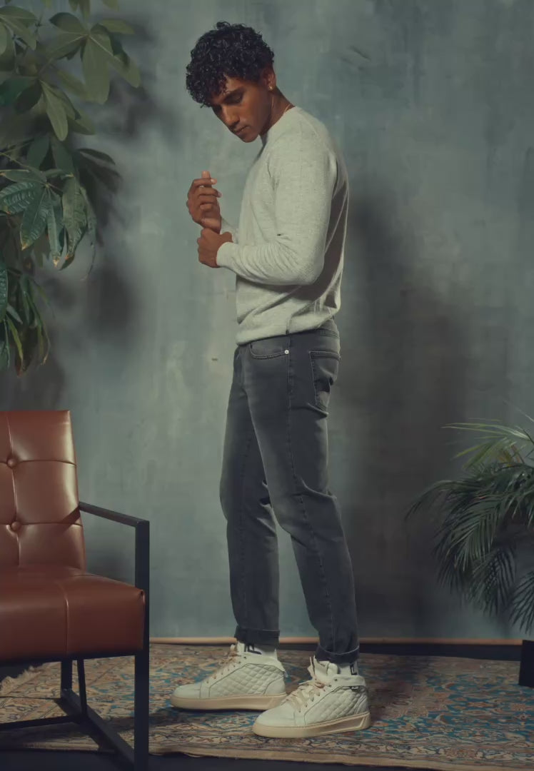 Sneakers in pelle bianca bottalata con trapunta. Il soletto interno è in poliuretano ed è anatomico per garantire maggiore comfort. La fodera è in cotone traspirante. La suola è in Eva ultraleggera di colore crema. Etichetta in pelle con logo "Drudd" stampato sulla linguetta. Prodotto 100% made in Italy.
